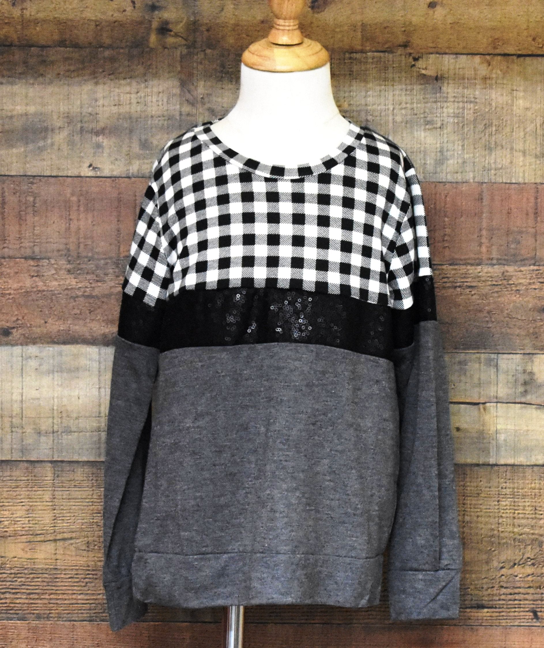 This stylish Buffalo plaid top will have any young girl looking fashionable and confident! The playful sequin strips make it perfect for any special occasion - she'll love it!