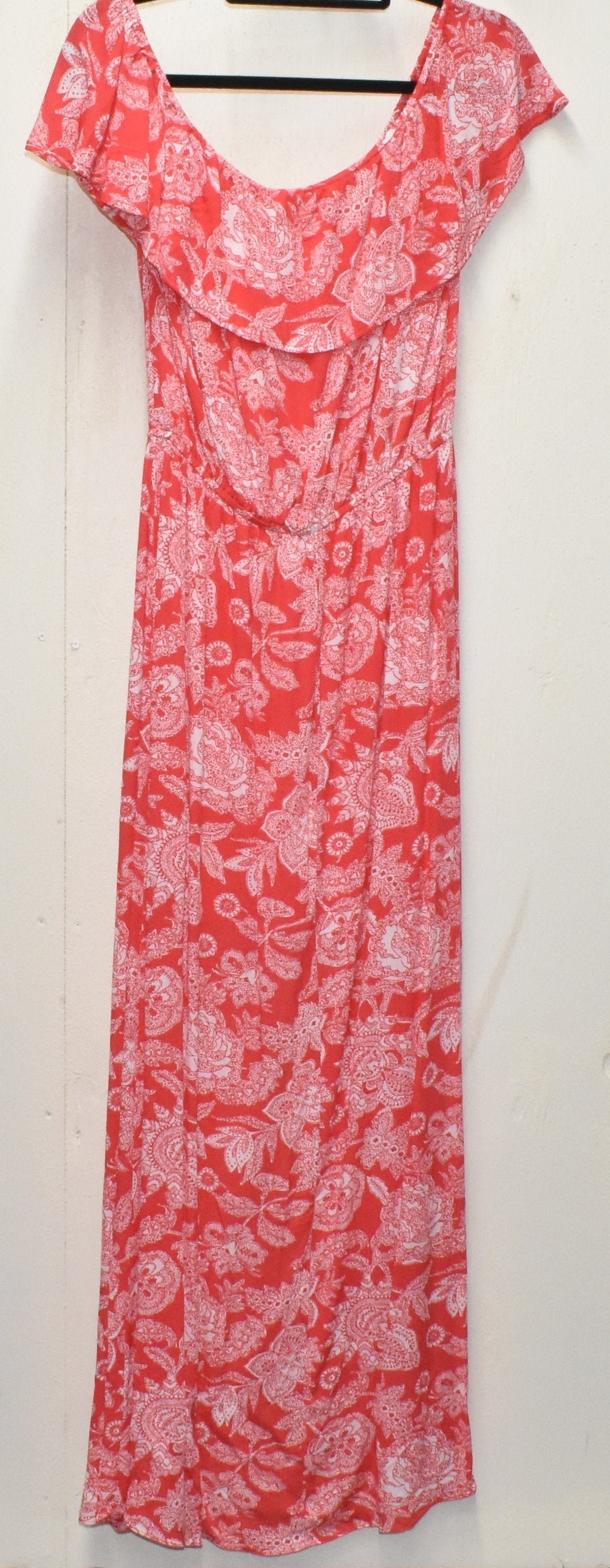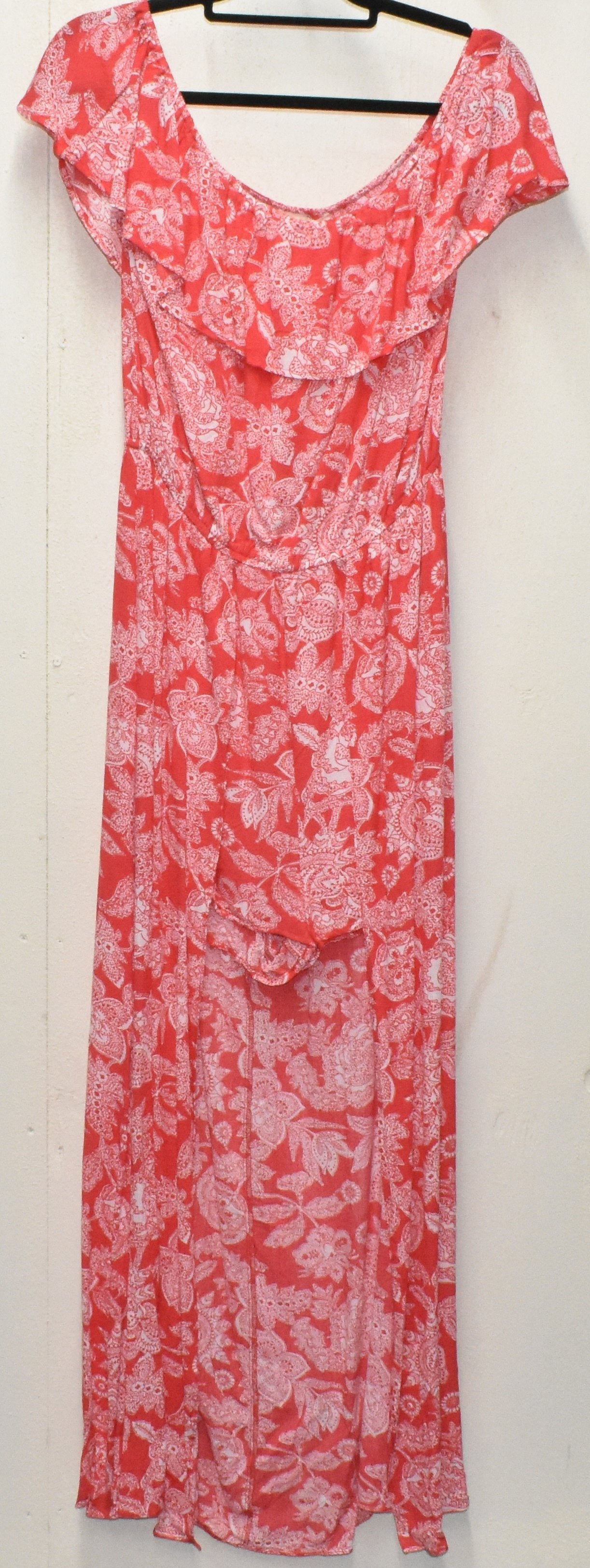 Coral Print Romper With Maxi Train. This is a coral colored romper with shorts and a maxi train. Fits loosely. This does have the feature of wearing it off the shoulder or rested on top of shoulder. Perfect for summer! This romper can be casual or dressy, you choose the accessories.