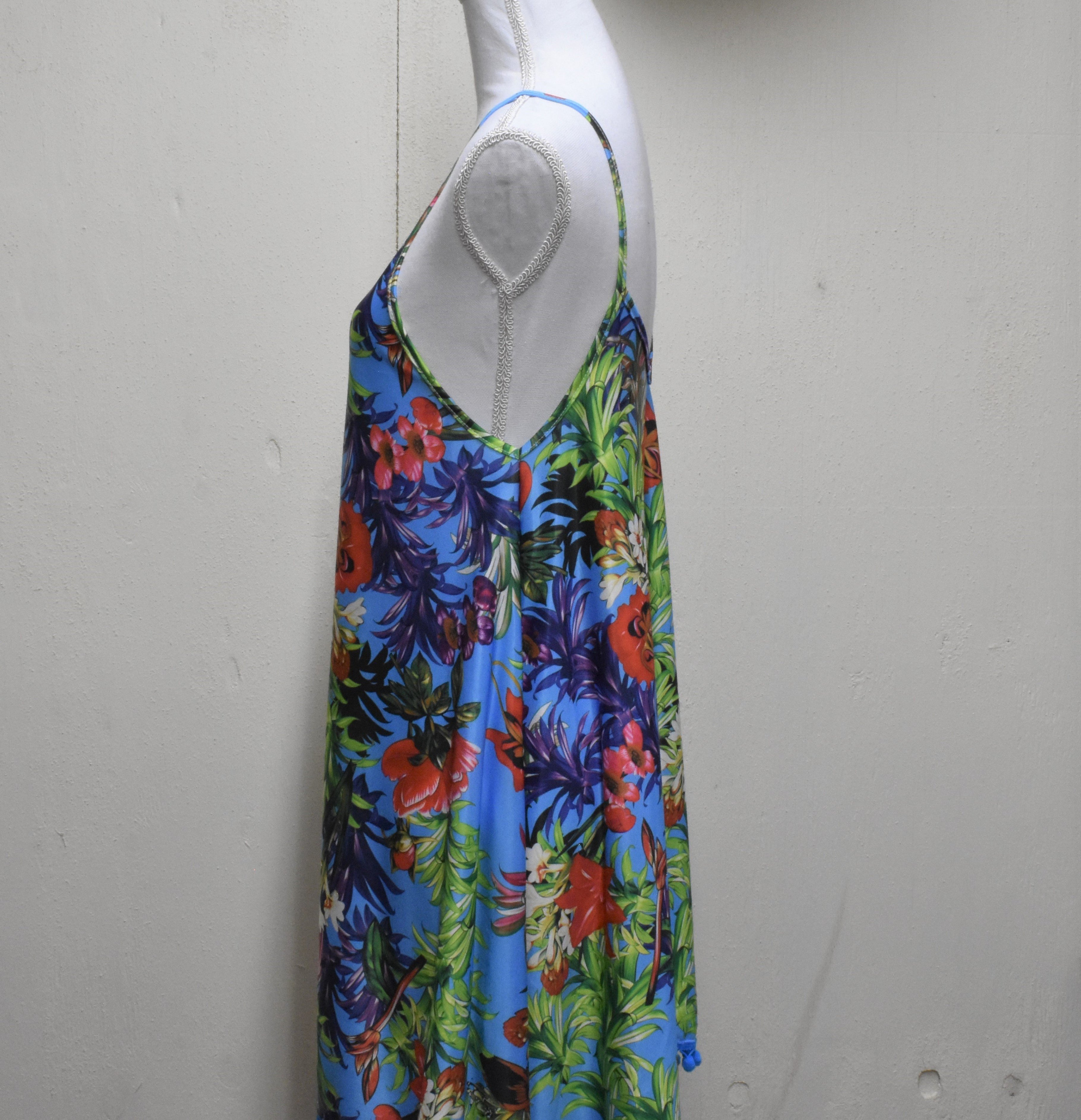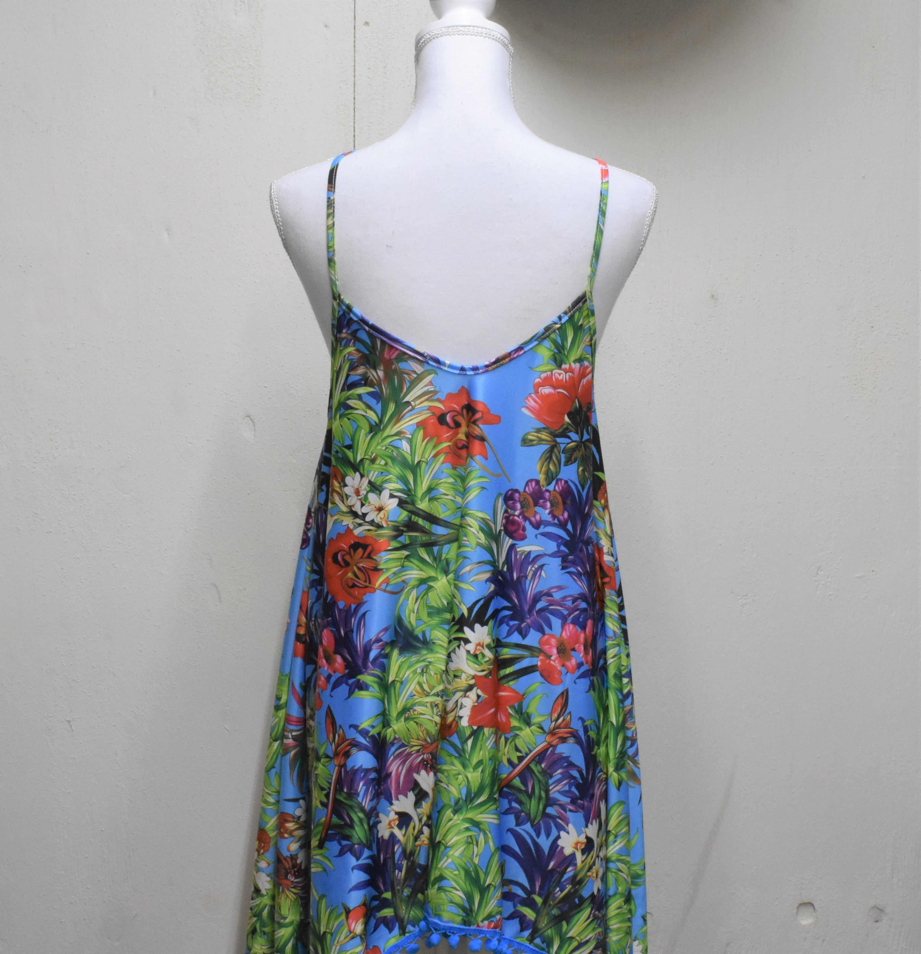 Trop(ical) into summer with this fun-filled tropical print spaghetti strap dress! The ideal beach cover up with added flounce from the pom-pom trim. You'll be ready to hit the clouds with toes in the sand and style to spare. Get ready to vacay in style!