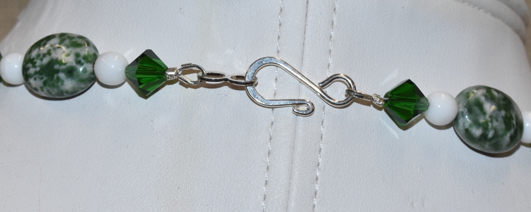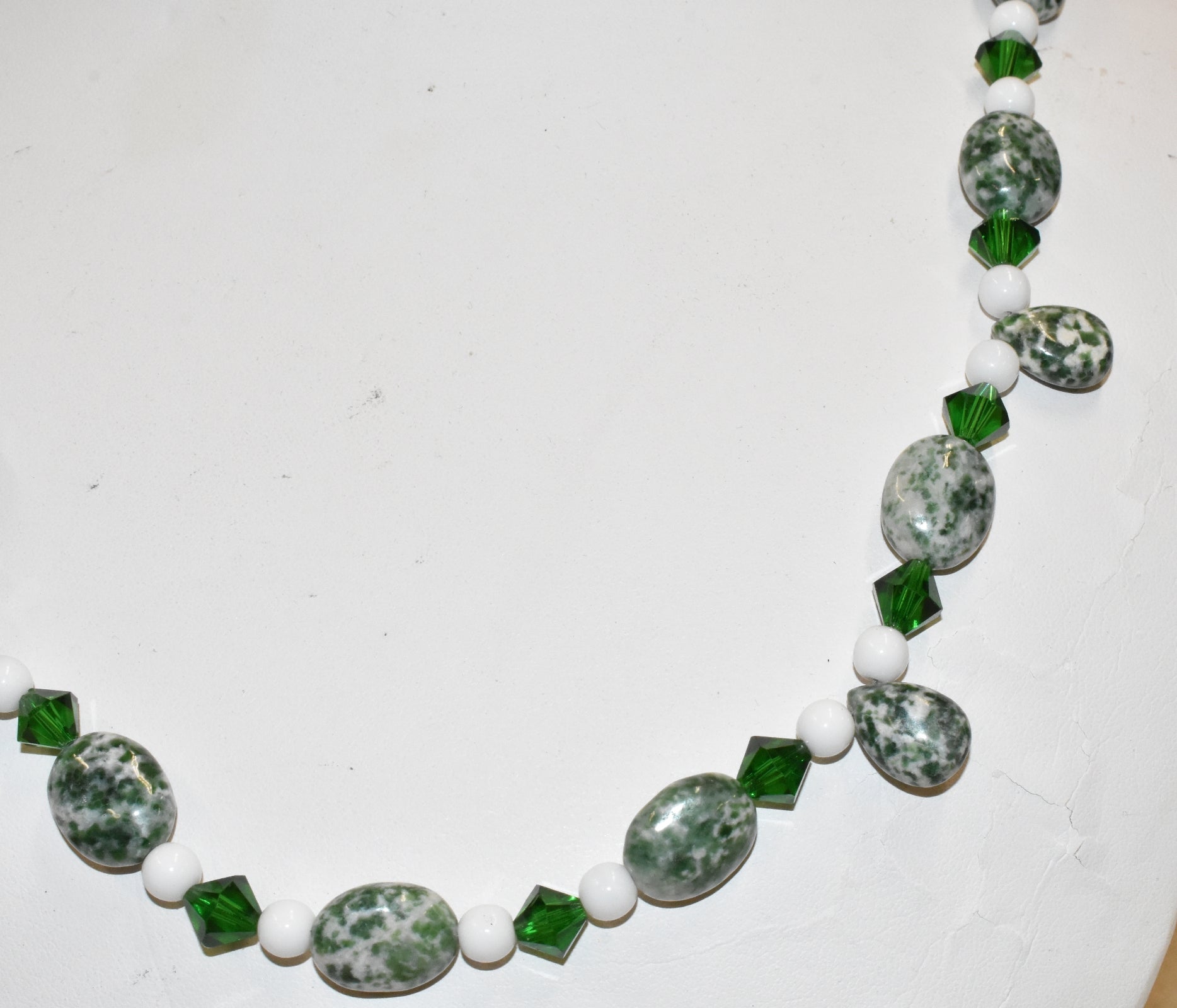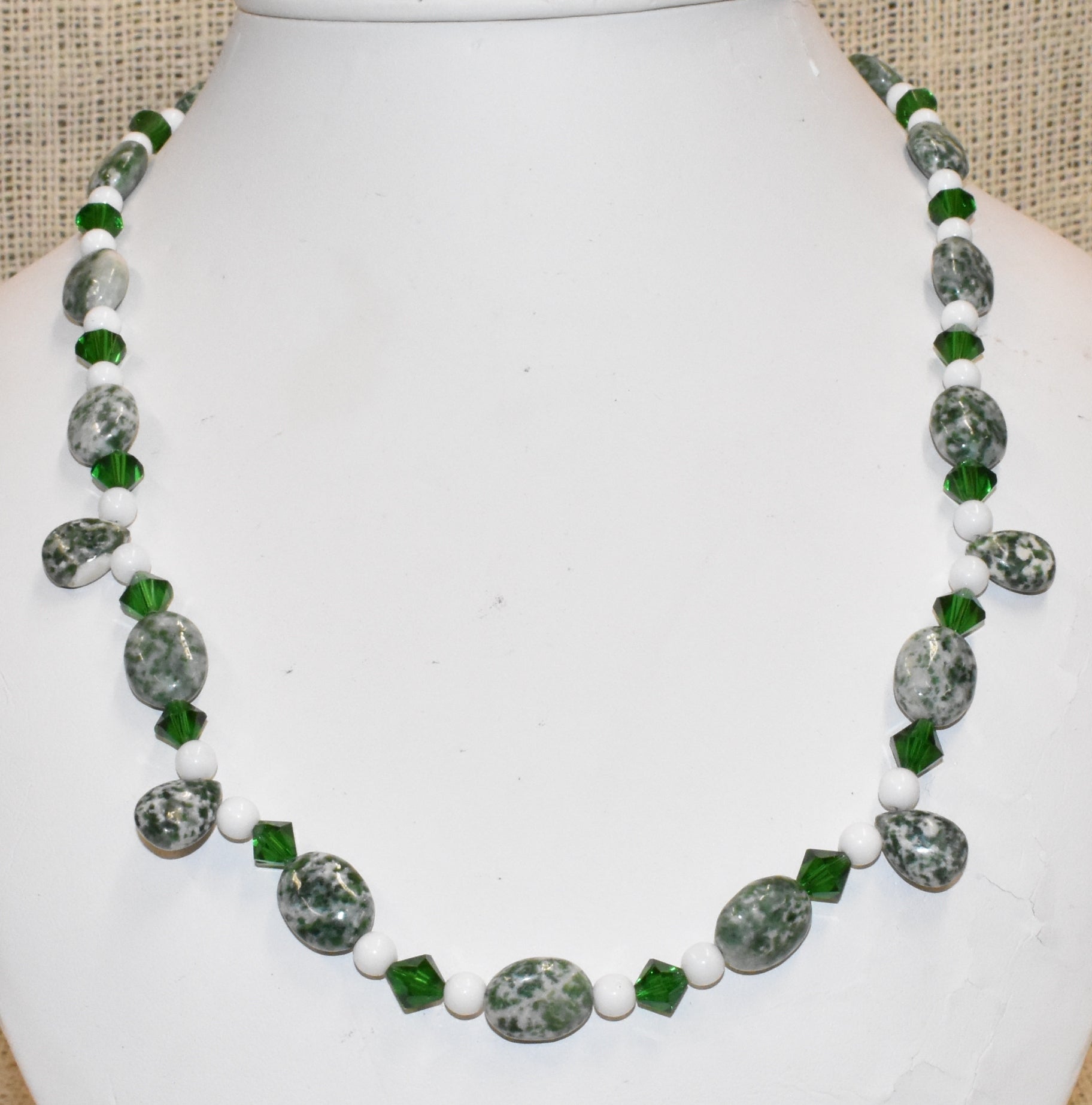 Handcrafted Necklace Green Tree Agate, white druk beads and emerald color crystals. This is a one of a kind, designed and handmade by D & W Designs. The necklace is 24 inches long with a silver plate hook and eye closure.