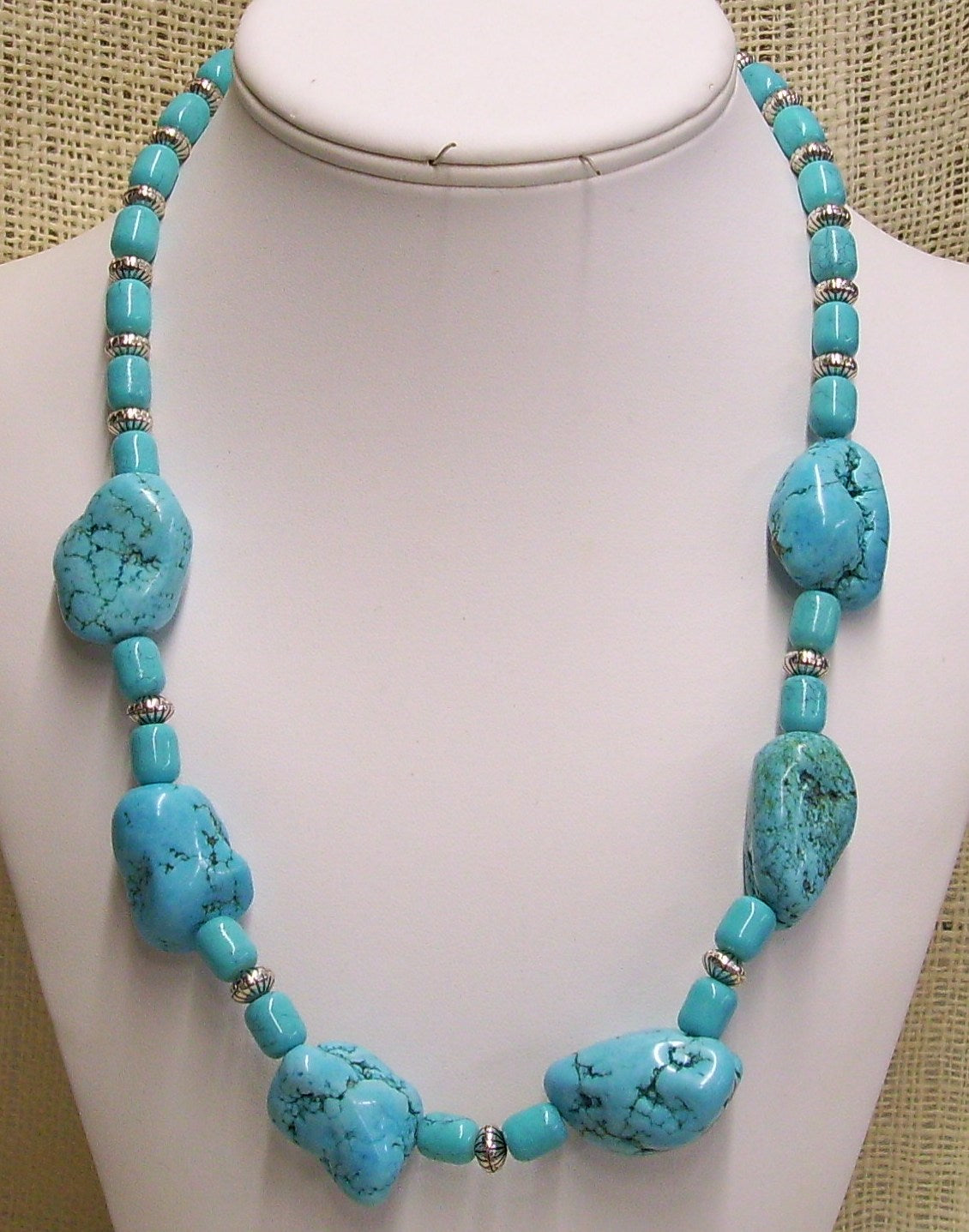 Express your unique style with a beautiful, one-of-a-kind, handmade turquoise nugget necklace. The turquoise color magnesite stones and silver plate spacers are perfectly paired together to bring out the beauty of both. A must for any jewelry enthusiast!