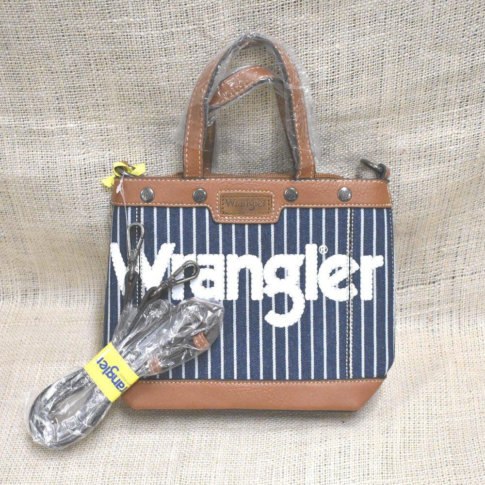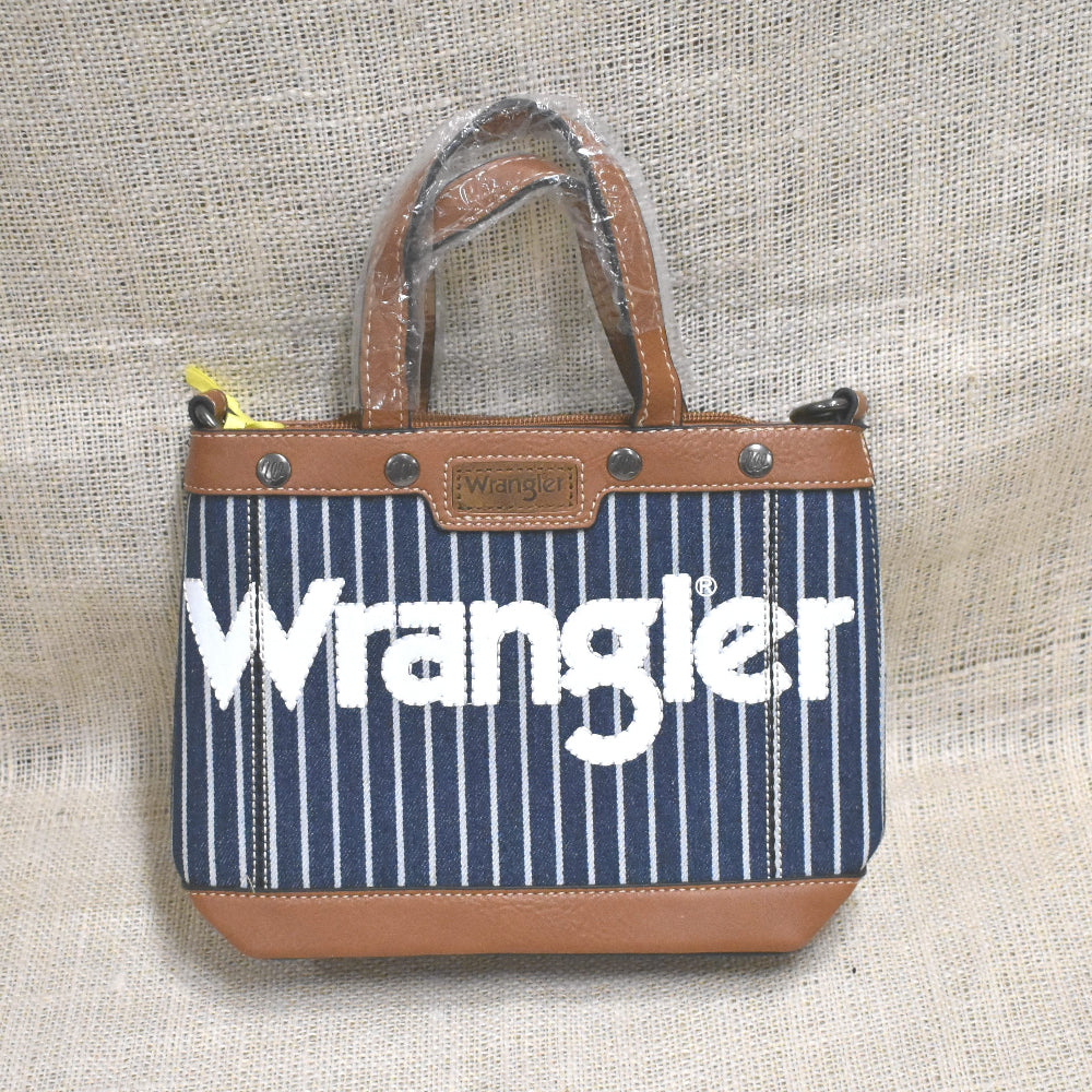 Introducing the Wrangler Bag by Montana West, perfect for those who love a mix of style and durability! This navy blue bag features classic stripes, made from sturdy canvas and leather. Wrangle up your essentials in one stylish place with this versatile bag.