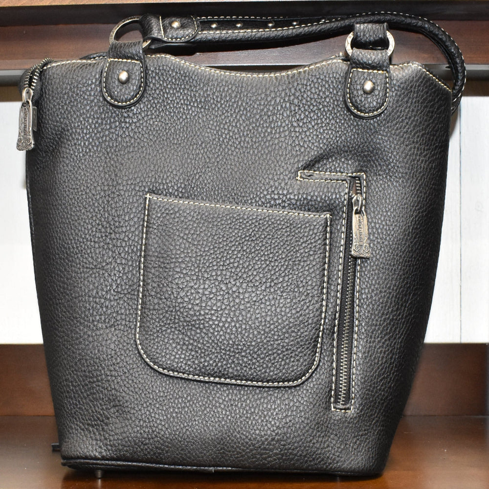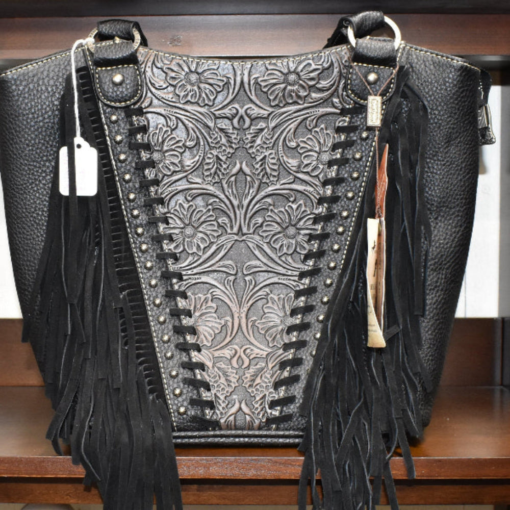 Elevate your style with our Black Concealed Carry Handbag featuring a leather tooled front and stylish fringe. With a hidden compartment for your protection, this handbag combines fashion and function for a sophisticated and exclusive accessory. Perfect for the modern woman on the go.