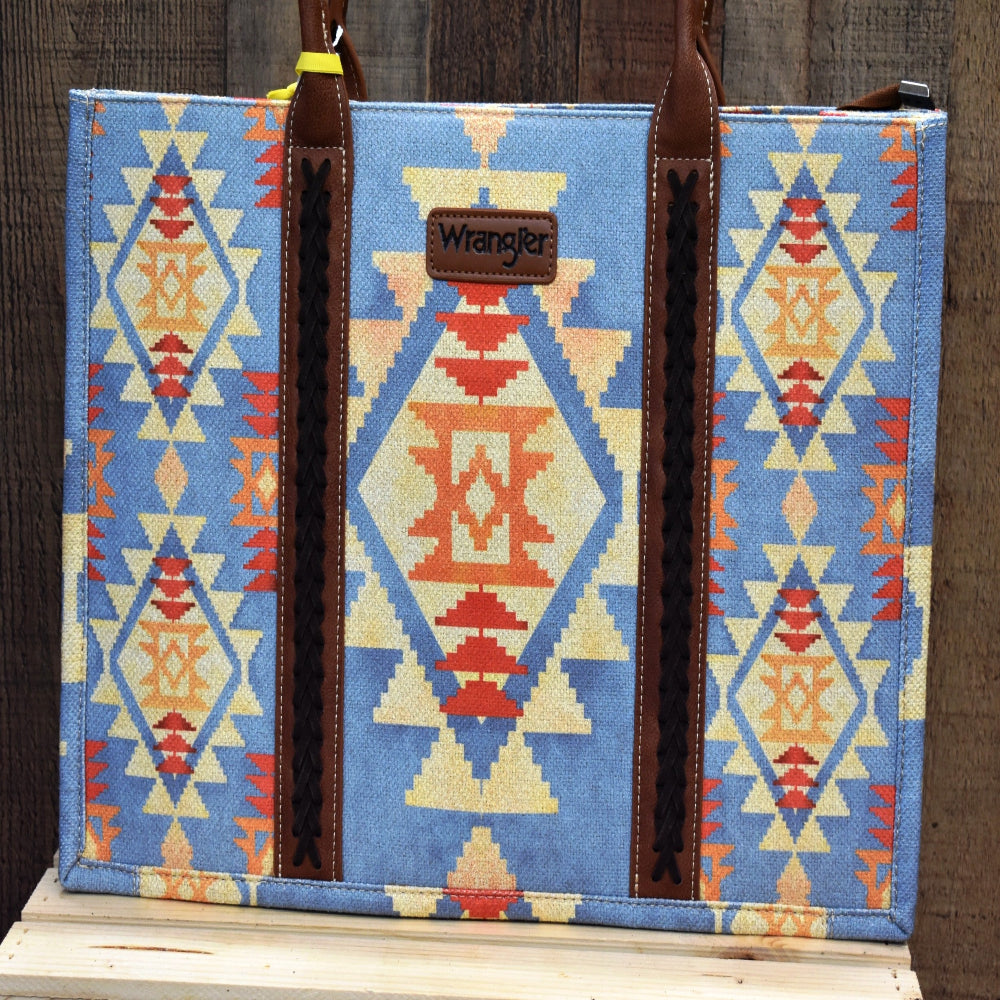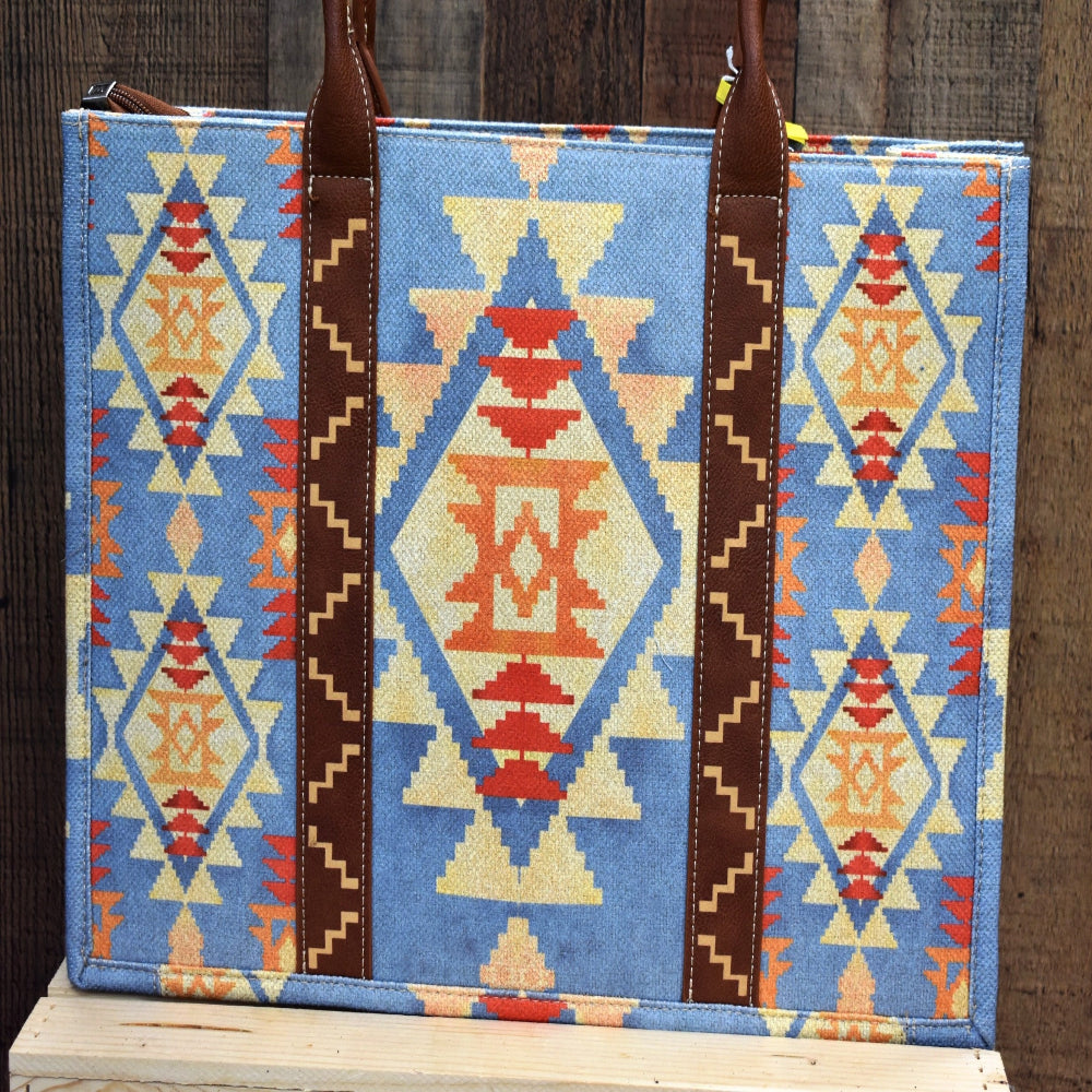 This stylish Wrangler Tote Bag is perfect for creating a bold look on the go. Its spacious design is perfect for carrying your laptop and other essentials on the go, while its beautiful and eye-catching blue Aztec design adds a modern flair. Make a statement with this fashionable and functional tote bag.